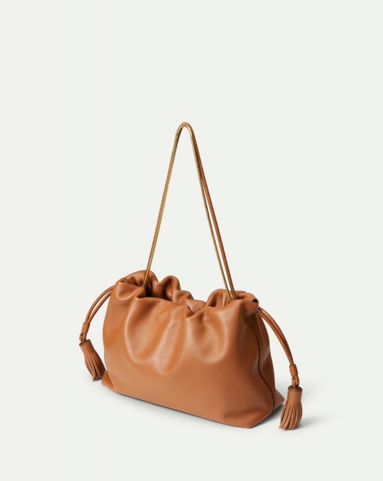 A cool take on the classic drawstring bag. Crafted from smooth, supple brown leather, the Stash Bag features a soft silhouette with gathering up top, double tassels and double straps—including one in gold snake chains. An interior zip pocket and magnetic tab closure keeps your belongings safe and secure. Leather Lining: Microsuede 12.6” L x 3.9” W x 8.3” H Strap drop: 11.4” Store in a cool, dry place and wipe any surface dirt with a dry cloth Style #H2502HL124Y085