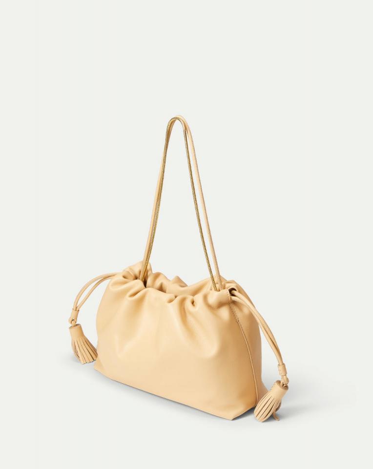 A cool take on the classic drawstring bag. Crafted from smooth, supple beige leather, the Stash pouch bag features a soft silhouette with gathering up top, double tassels, and double straps—including one in gold snake chains. An interior zip pocket and magnetic tab closure keeps your belongings safe and secure.LeatherLeather Lining: MicrosuedeMaterial country of origin: USA8 3/10” L x 12.6” W x 3.9” HStrap drop: 11.4”Store in a cool, dry place and wipe any surface dirt with a dry cloth. Due to the delicate nature of the leather, please note it may scratch or crease over time. Handle with care to extend the life of your bag.Style #H2503HL124Y085