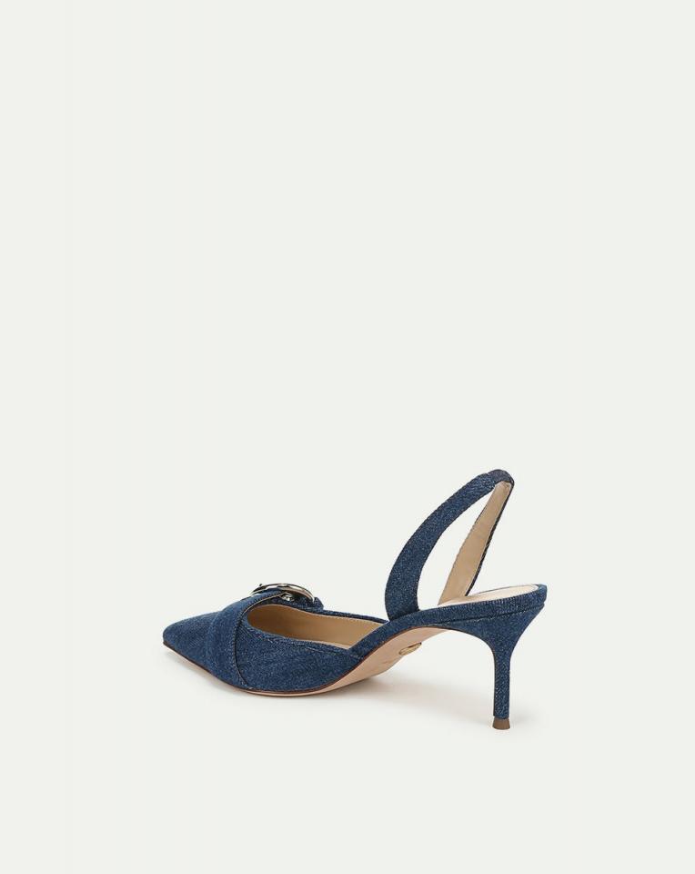 A cool twist on the ladylike slingback. The Roxy is defined by a bold buckle at the vamp and an allover denim body. It features a 2.5″ mid heel, a pointy toe, a cushioned leather footbed and an elasticized strap for comfort. Style with a double-denim look to heighten the polish.DenimLining: Leather2.5″ heelStore in a cool dry place inside dust bagClean under the supervision of a specialistStyle #J3746F1
