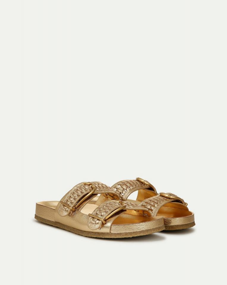 Introducing Paige, the wear-everywhere pair that marries everyday comfort with luxe details. Made from gold metallic leather that molds to your foot, two interwoven straps are finished with oversized gold-tone buckles. The cushioned footbed ensures endless wearability.LeatherStore in a cool, dry place inside dust bagClean under the supervision of a specialistStyle #J0000L3