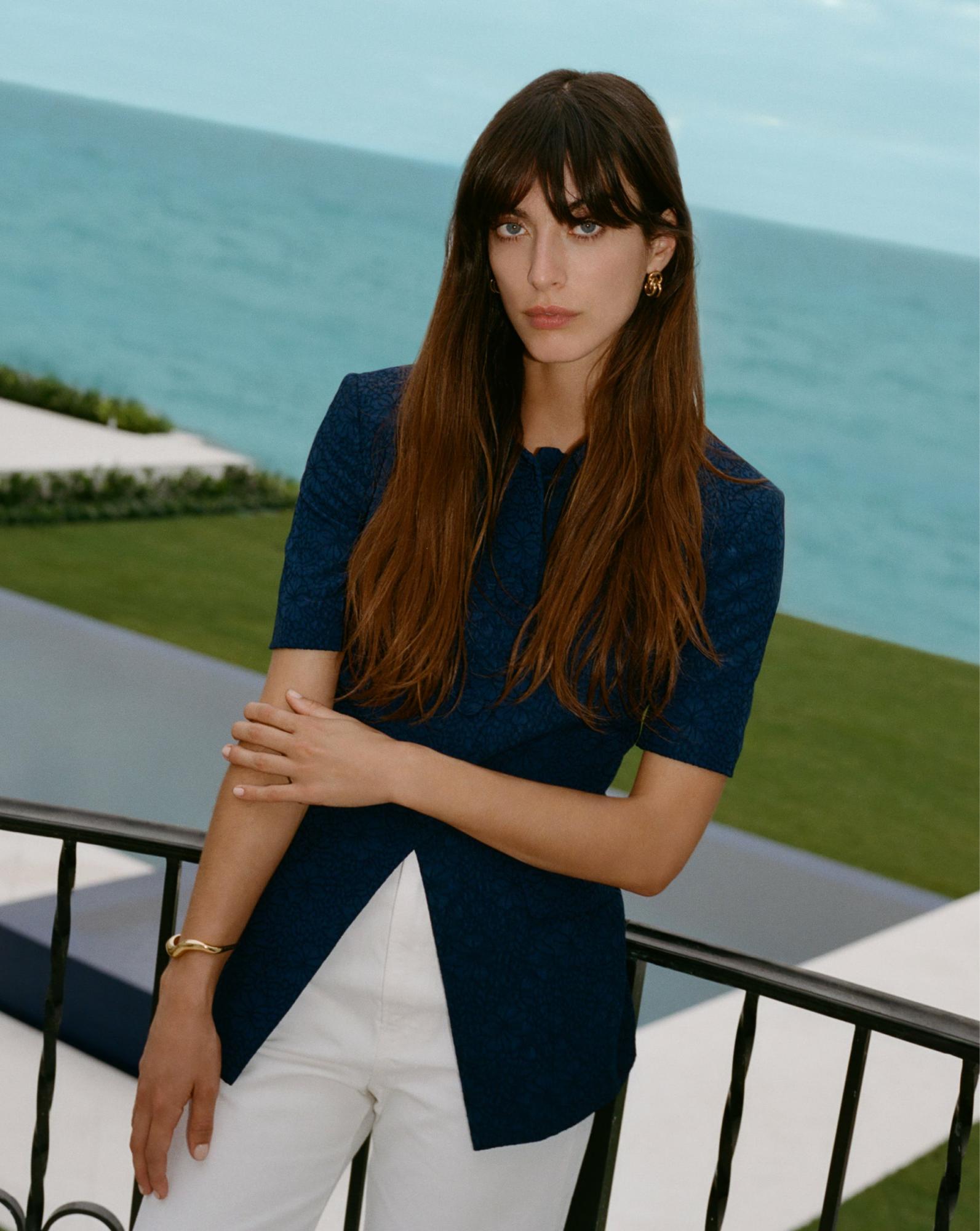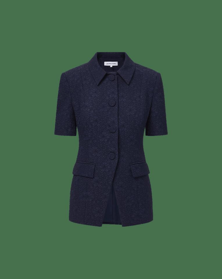 Impeccably tailored in a premium jacquard with an elegant navy tonal floral pattern, the Bodie is a structured jacket designed with an elongated, slim-fitting silhouette. Strong, padded shoulders and darting at the waistline create subtle shape, while front flap pockets, an angled cutaway hem, and matching covered buttons complete the look. Wear this textured blazer jacket with the coordinating Dell pants for a sleek matching set. 100% Polyester Unlined Dry clean only Covered buttons Style #2503JQ3811036