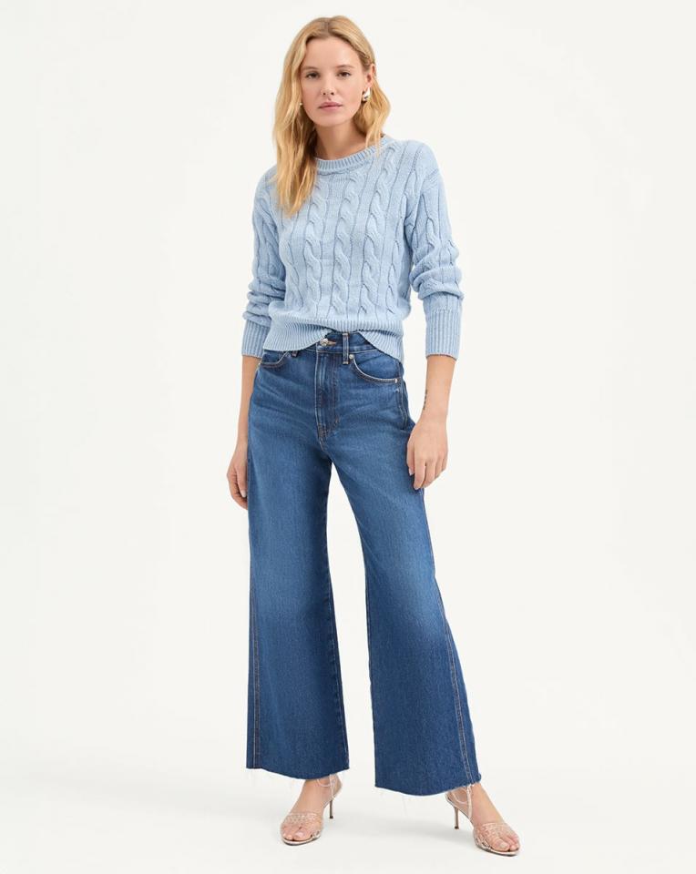 An essential layer for transitional weather, in fresh light blue. The Eleanor pullover sweater is spun from an ultra-soft linen-silk blend, featuring a classic cable-knit pattern and ribbing along the cuffs, hems, and neckline. Cut for a slim yet relaxed fit, this crew neck sweater seamlessly layers over and under the rest of your wardrobe. Pair it with tailored shorts or denim, or drape over your shoulders when you need an extra layer on hand.90% Linen, 10% SilkDry clean onlyStyle #2503KL1590366