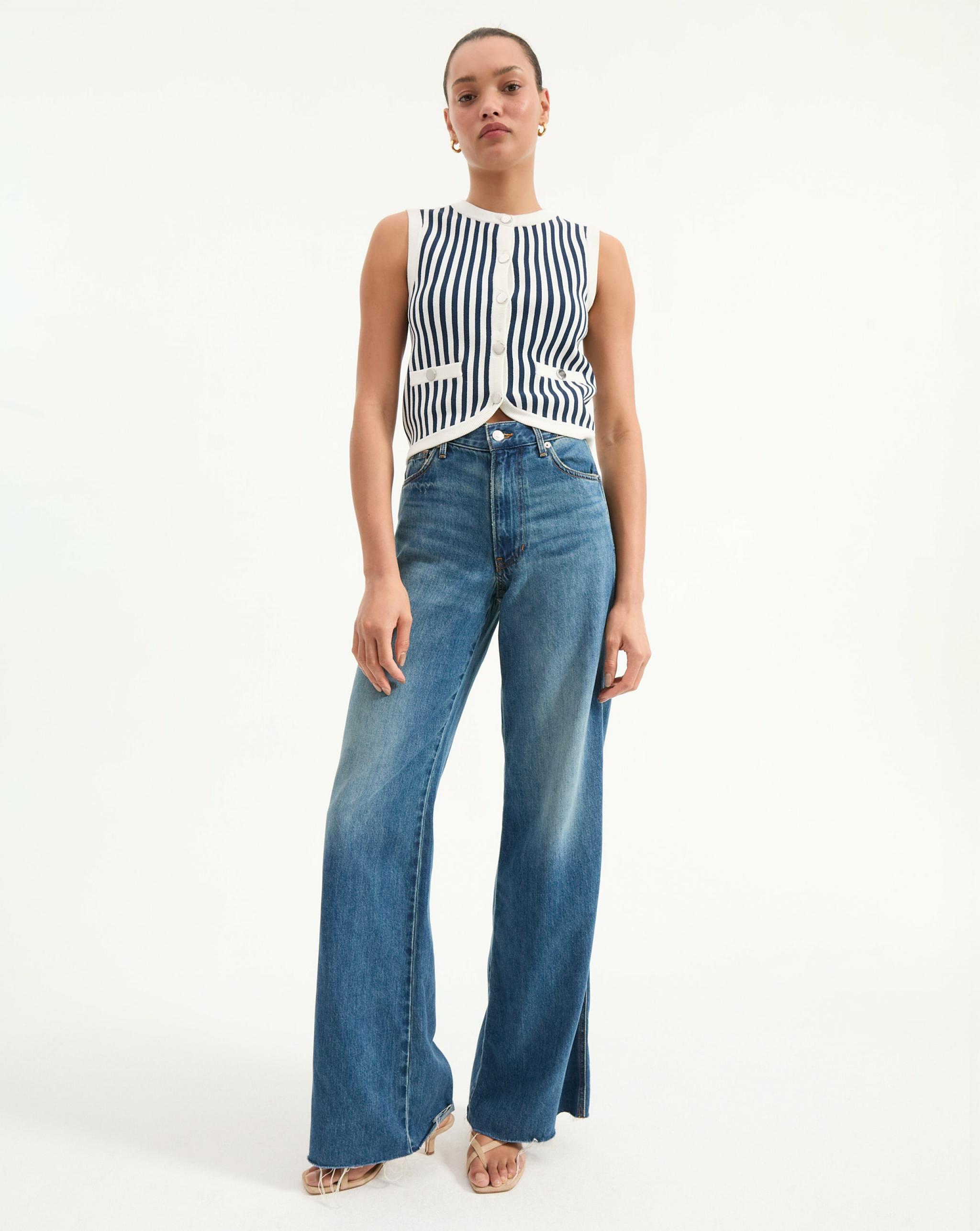 Spun from a premium stretch blend, the Leland sweater vest is defined by nautical navy and white stripes and a ribbed, contrast-color trim. With a cropped fit and a curved hem, this vest top is finished with a jewel neckline, a welt pocket, and silver buttons. Dress it down with jeans or go for polish with the matching Corbin skirt. 83% Viscose, 17% Polyester Unlined Dry clean only Style #2503KS1290602